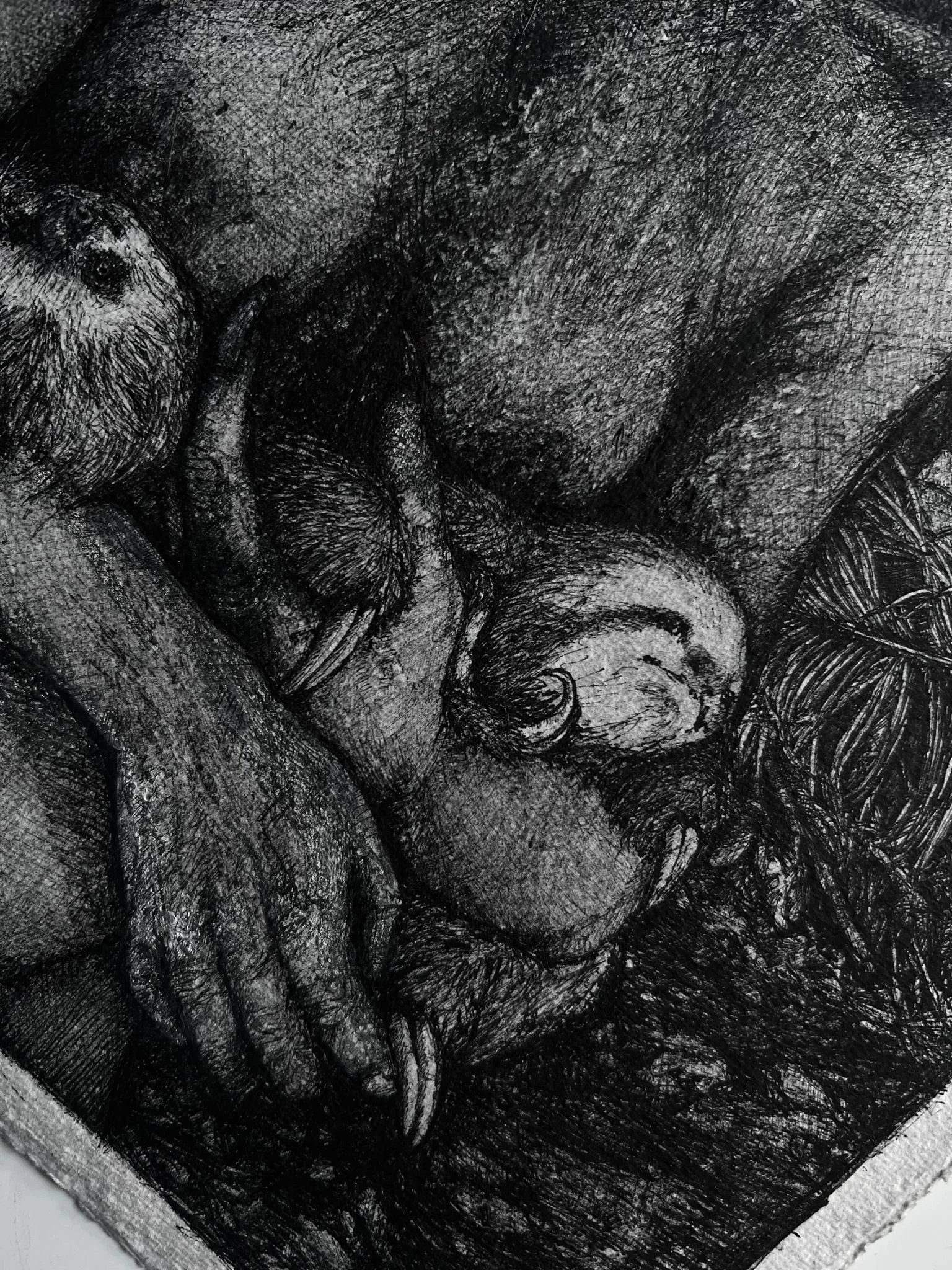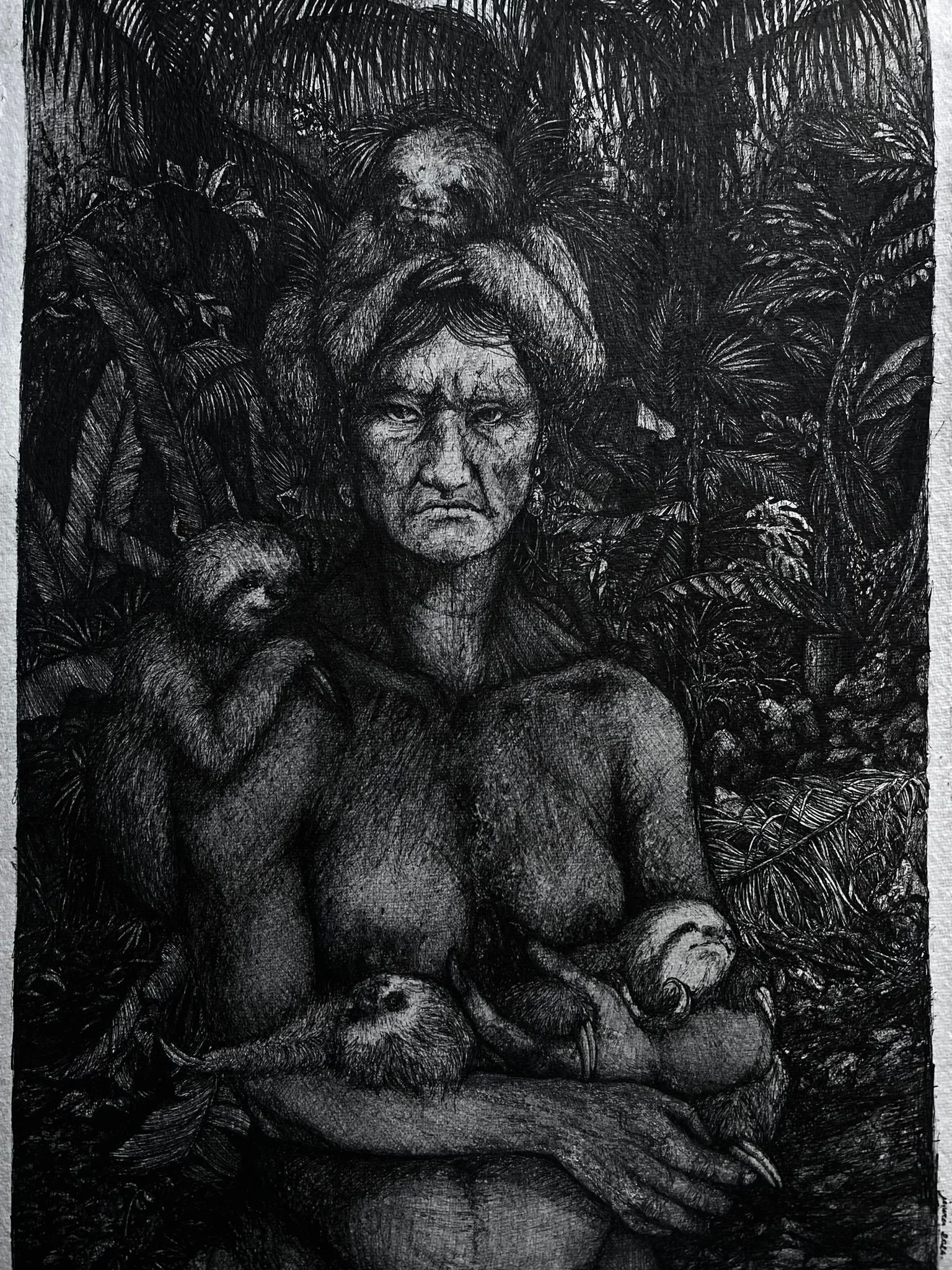 LA MUJER INDÍGENA CON LOS PEREZOSOS stylo, 42 x 29,7 cm